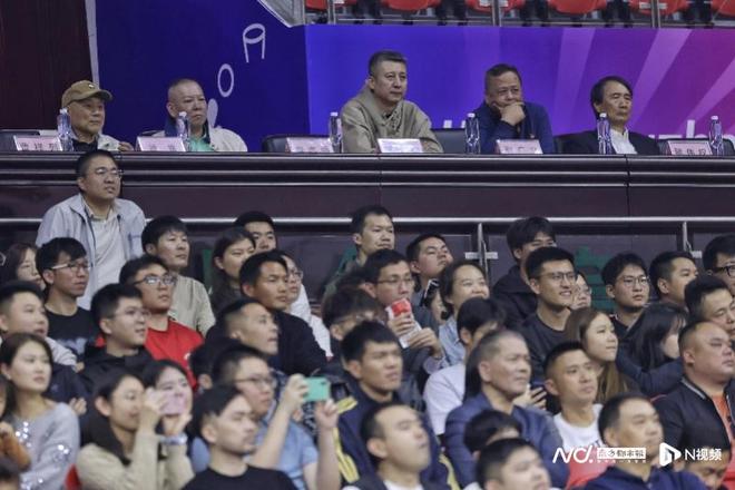 中国男篮主教练郭士强(主席台左三)在广州队看台上目睹了郭艾伦受伤。南都N视频 黎湛均摄